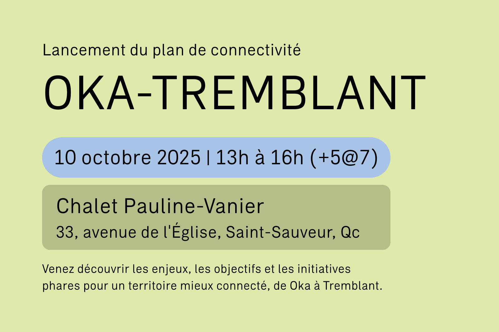 Le 10 octobre 2025, joignez-vous à nous de 13 h à 16 h (suivi d’un 5@7) pour le lancement du Plan de connectivité Oka–Tremblant, une occasion unique de découvrir comment des actions concrètes peuvent bâtir un territoire mieux connecté.