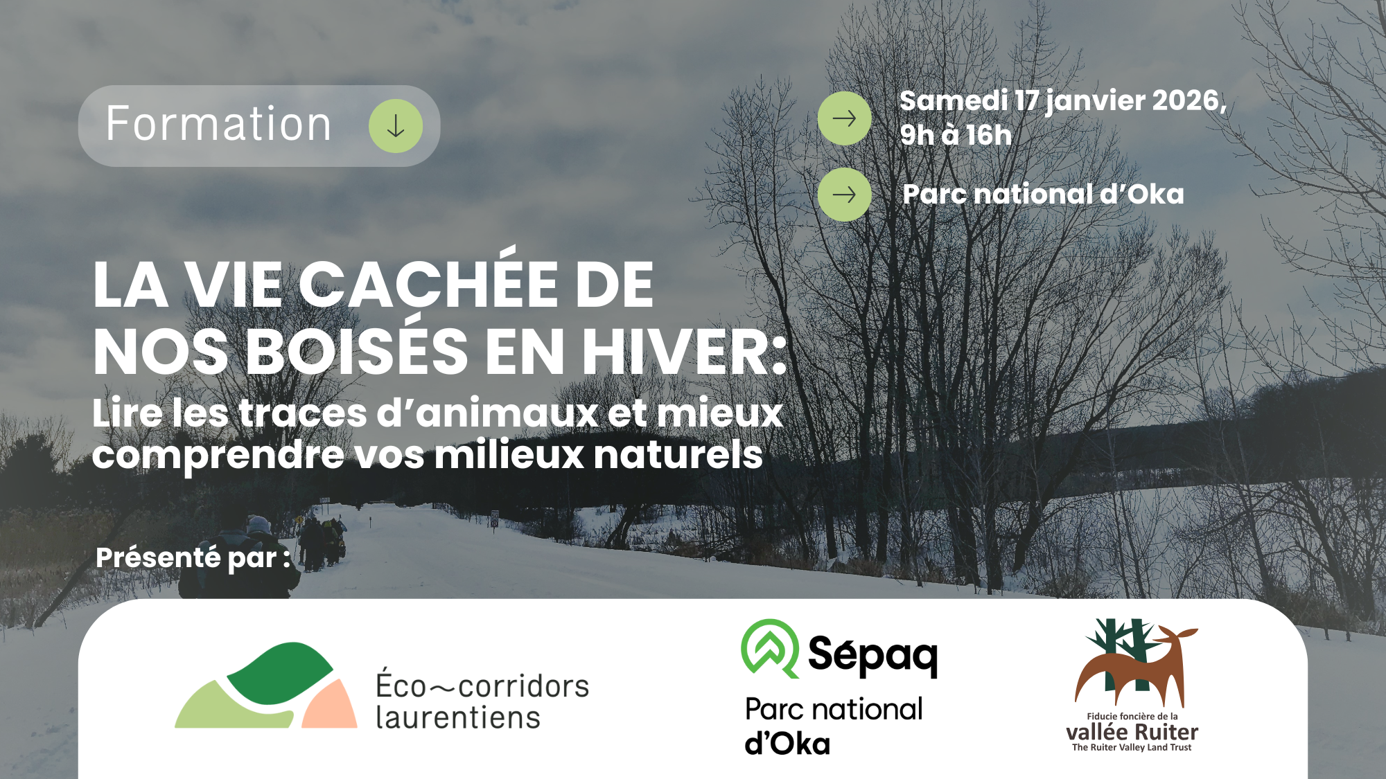 Cette journée de formation en pistage faunique au parc national d’Oka s’adresse aux citoyen·nes engagé·es et plus spécifiquement aux propriétaires de terrains boisés ou de milieux naturels qui souhaitent mieux comprendre la faune présente chez eux et réfléchir à la conservation de leurs milieux.